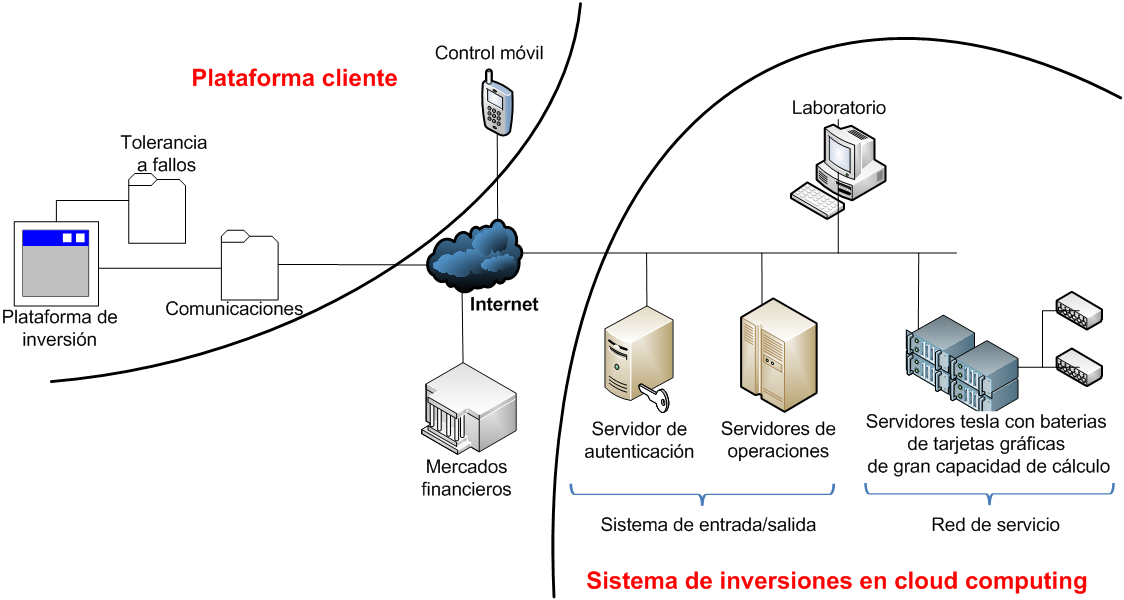 El proyecto se dirige a las empresas o ciudadanos que necesiten una fuente de financiación sin riesgo, y sin coste. El acceso a los sistemas que generan las operaciones se hará mediante Internet. La plataforma de ejecución de los procesos de optimización de operaciones está basada en CPUs multi-núcleo y tarjetas gráficas NVIDIA, que ofrecen una gran capacidad de paralelismo, y por tanto grandes capacidades de cálculo. El cliente del sistema podrá seguir su evolución desde un dispositivo móvil, desde el que podrá controlarlo. La plataforma cliente dispondrá de un sistema de tolerancia a fallos que se activará si falla la comunicación con el sistema cloud, y que será capaz de mantener la operativa ya abierta, e incluso generar nuevas operaciones, según las últimas estrategias enviadas desde el sistema cloud. Además se va crear un laboratorio para depurar, testear y optimizar las estrategias de inversión que se llevarán a cabo en tiempo real. Así, el laboratorio es un cliente más de la plataforma de cálculo. La siguiente figura muestra un diagrama de arquitectura de alto nivel del sistema IYELMO.